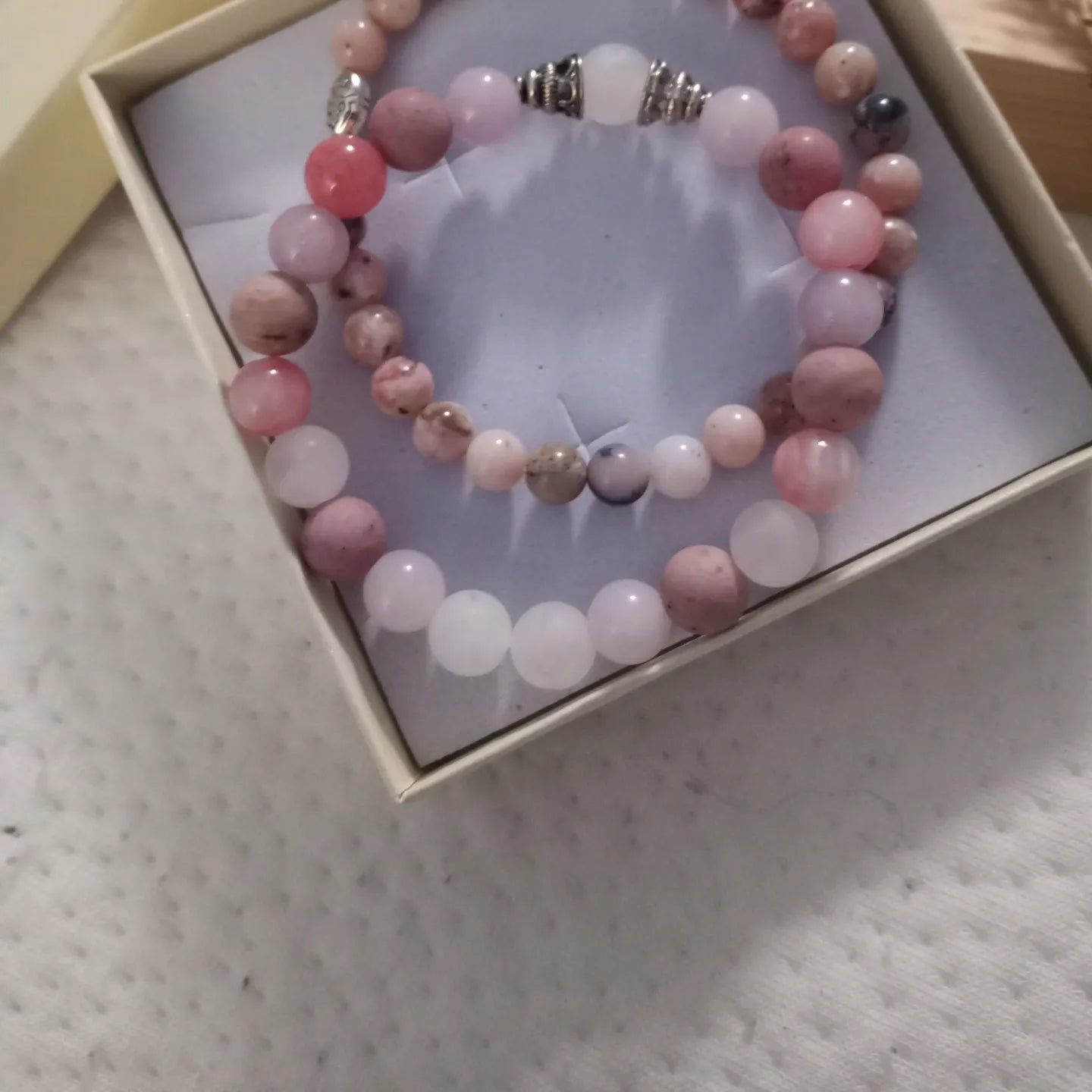 A Beautiful Pink Zebra Opal/Jasper set cast with pale pink Rose Quartz and stainless steel spacer beads! Pink Zebra is associated with calmness, stability and emotional balance. It's often seen as a heart-soothing stone that brings contentment, joy and a sense of security.
